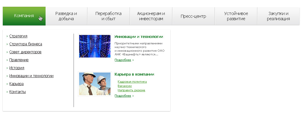 Было разработано информативное выпадающее меню с анонсами подразделов, благодаря которому можно перейти на любую внутреннюю страницу сайта, не потратив времени на поиск.